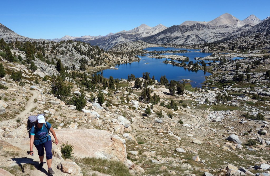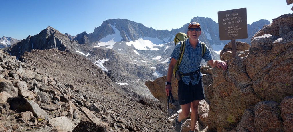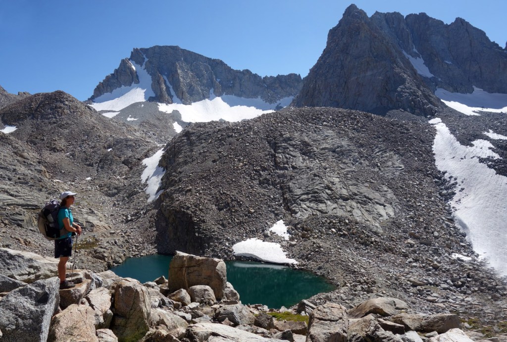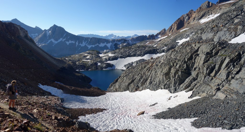 We started the next day with more chilled out JMT trail walking through Evolution Valley before striking steeply uphill off trail to Darwin Bench. Actually there was a pretty good ‘use trail’ much of the way but with some boulder hopping round the fine turquoise Darwin Lakes. After Lake 4 we stopped at its small beach before hitting the 1,000 foot climb up to Lamarck Col. The views opened out as we followed various sandy trails with the odd scramble to pop out at the col in late afternoon at 12,800 feet. A grand spot.