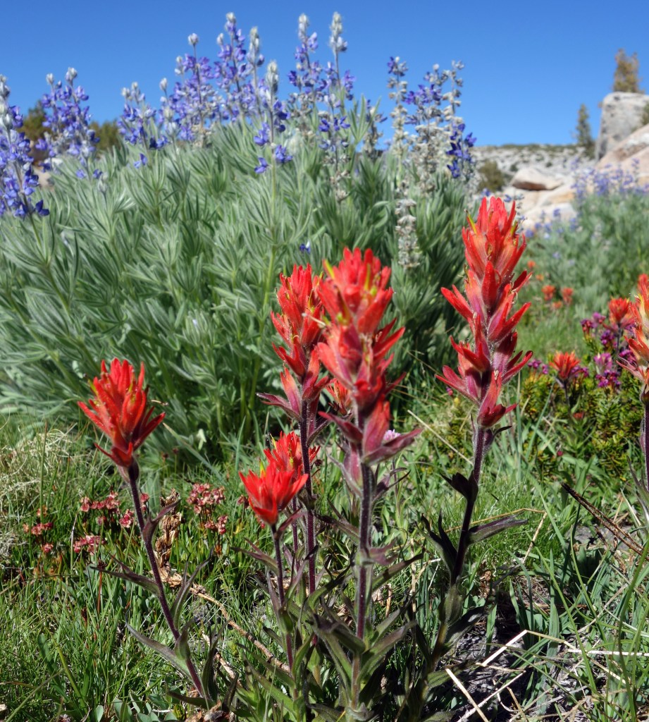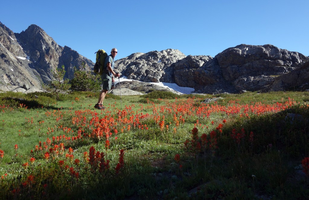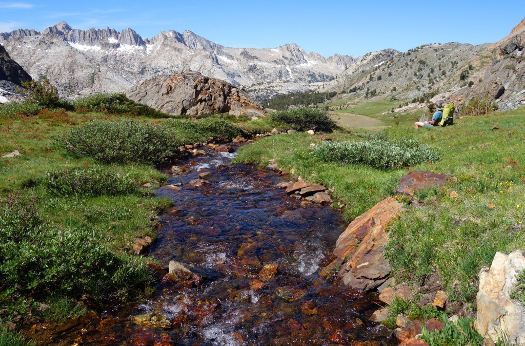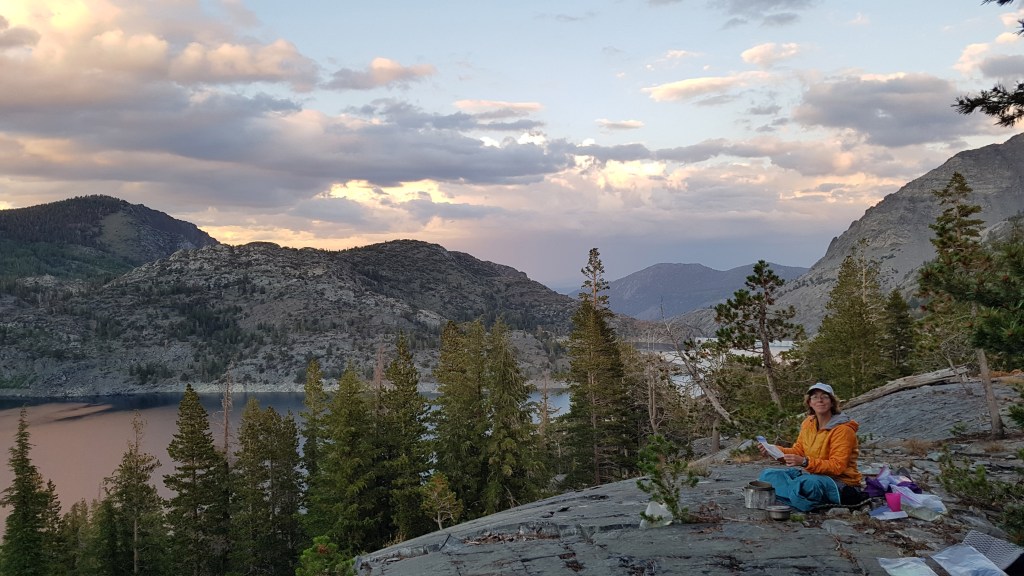 The next section of hiking was not particularly hard but felt quite ‘out there’ without any trails through complex terrain – well described by the Steve Roper guidebook though. We found a welcome patch of trees just below an old mine working to stop for a rest before descending steeply past vibrant colourful flower gardens. After lots of winding between outcrops we arrived at the northern of Twin Island Lakes and found a way round the eastern shore on grippy, slabby granite. The outlet from the lake can provide a very deep wade but today it was about mid thigh and fairly gentle so turned out to be a pleasant, refreshing dip. Easy granite slabs gave a good route up to the southern Twin Island Lake and round the east side and we called it a day in the meadows to the south. A brilliant backpacking day! (Brian nipped up the hill to the south east after dinner but the views were limited in the dimming light).