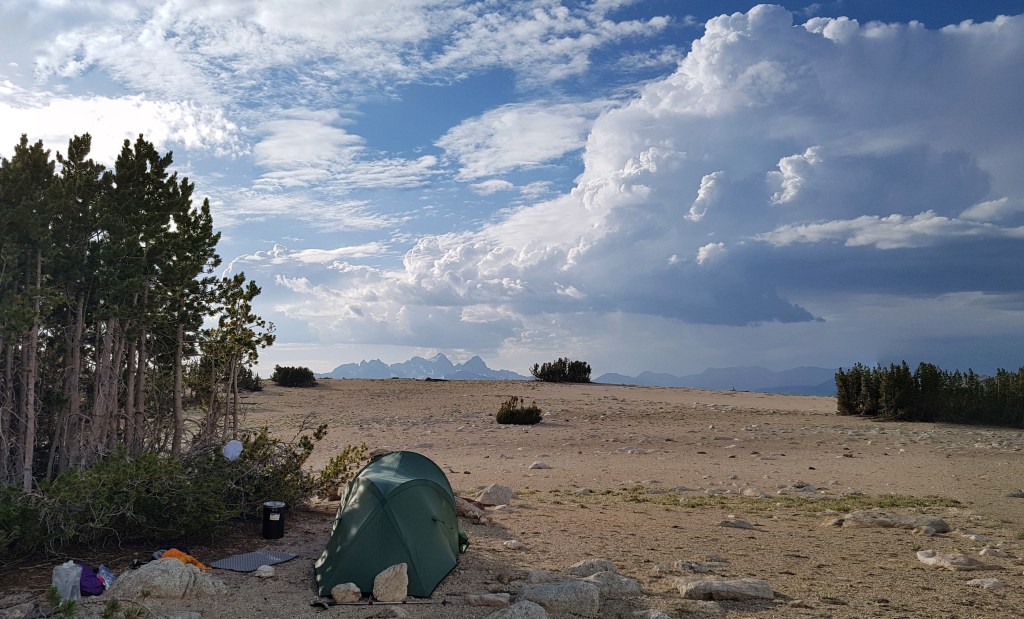 We set off on a rather beautiful cross country rambling descent down through meadows, past dotted lakes and streams. We soon picked up a trail below Rams lakes that took us down to Purple Lake. Saw a white owl in the trees and an osprey catch fish on the lake. Back on the wide PCT we headed northwards and turned off soon again to climb up on another trail to the large Duck Lake. Someone kindly offered us some DEET mozzy repellent which Brian gratefully accepted! From Duck Pass we headed north west following notes for the Sierra High route on the broad ridge of the Mammoth Crest. We decided to haul water to camp on the plateau like ridge with panoramic views all round. Particularly north to Banner and Ritter mountains and south to south impressive swelling thunderclouds which we were thankfully able to watch from a distance.
