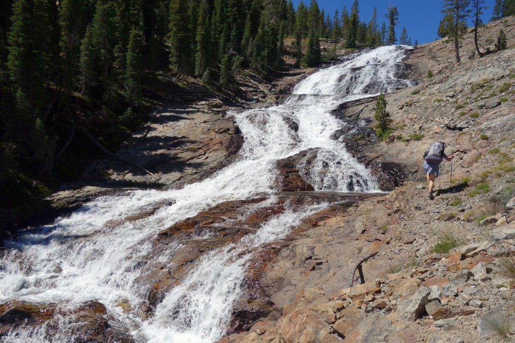 Our hiking was going well in this scenic area and with 10 miles to Tuolumne we were pleased to see the familiar figure of Eric hiking out to greet us. Gordon appeared as well at the waterfalls of Glen Aulin – his tendon had recovered well and sufficient to be able to hike out for a 14 mile round trip to here. After a cool dip in the pool below the waterfall we made the final seven miles to the road at Tuolumne Meadows in style and the four of us had a celebratory huge Mexican meal in the nearby town of Lee Vining that evening.