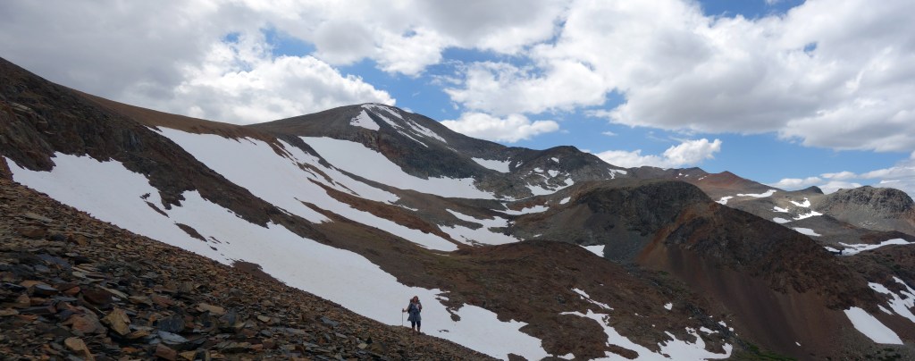 The air felt clear and alpine as we scrabbled round the lake over boulders and a few snow patches (microspikes came in handy). At the far north end we had a wee look around before Martina spotted the exit descent starting right at the lakes outlet stream. This was a bit loose and gravelly but quickly took us down to the next wonderful lake – Iceberg – well named!