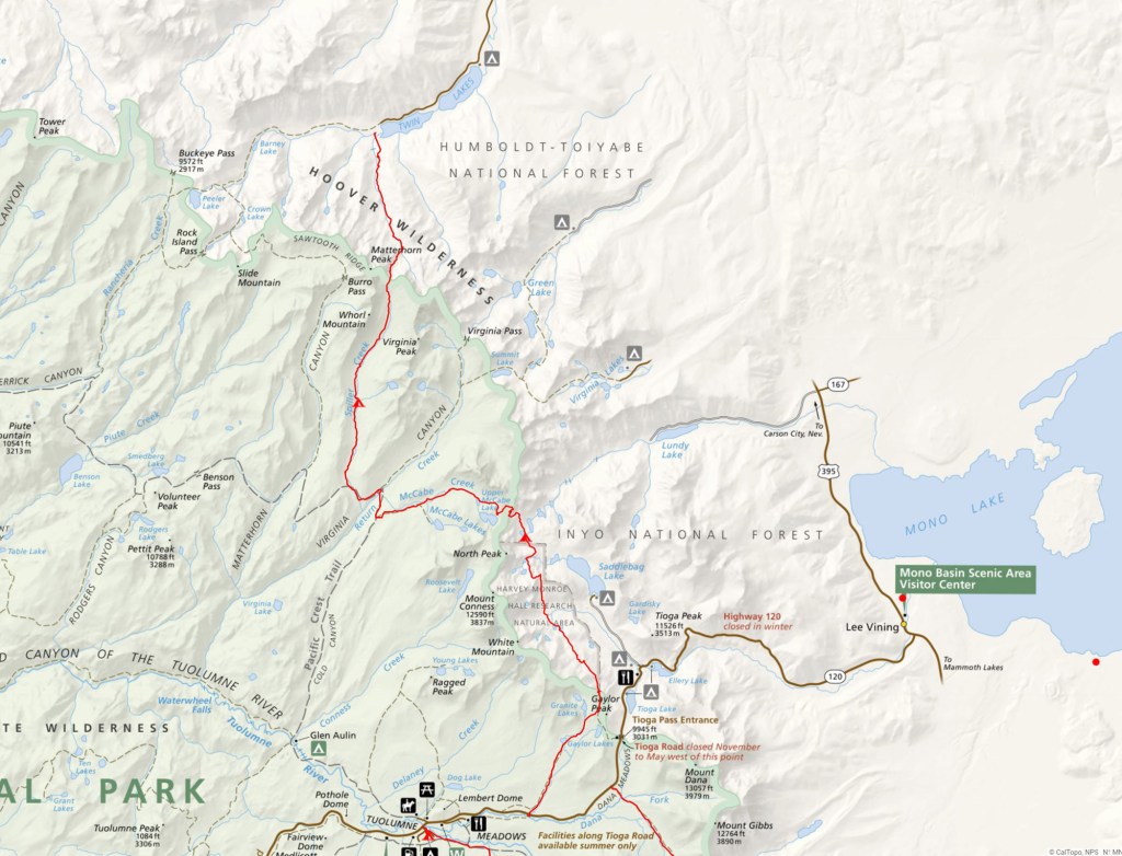 5th September 2019 This three day backpacking trip had us roughly following the northern section of the ‘Sierra High Route‘ in the Sierra mountains of California with another mix of cross country hiking, scrambling and trails. We drove north from Mammoth Lakes to the town of Bridgeport on the east side of the Sierra mountains and arranged a hiking permit for the trip at the ranger station. Like the rest of of our hikes on this holiday, we were able to get a permit for the same day which was a pleasant surprise. A short drive west took us to the Twin Lakes RV resort (via Buckeye Hot Springs to drop off a hitchhiker!) where we paid a small fee to leave the car for a few days.