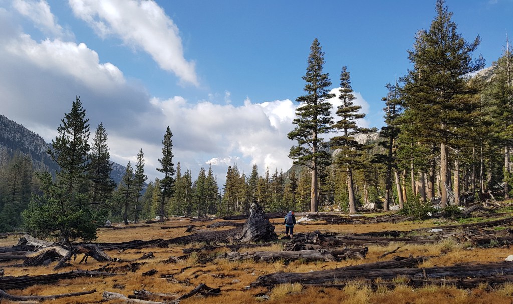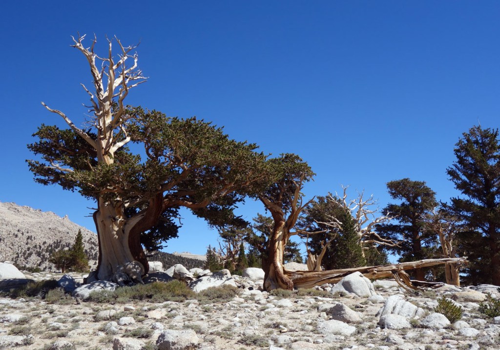 Since we didn’t start hiking that day ’til 3.30pm we only made it about 7 miles to camp at Kearsarge Lakes in a bitterly cold but lovely spot. There were bear-proof boxes provided here where we could store our food safe from bears, however we were amused to find out that this area was where ‘bad-bears’ from tourist spots around Yosemite valley are air lifted out to by park staff. We kept a careful look out that evening for any signs of bear activity but thankfully there was none. Two miles further hiking the next morning and we were back on the PCT again and heading south on our final stage! We noticed some lovely trees on the way south before finally crossed the highest point of the whole Pacific Crest Trail, Forester Pass at 13,180 feet.