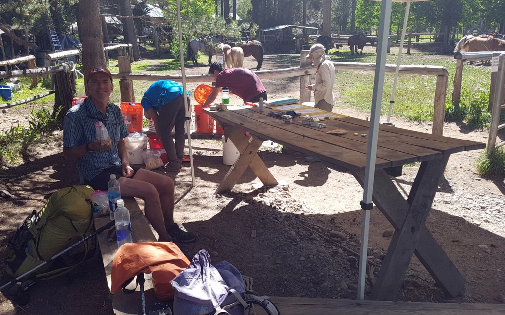 Boy was it cold in the morning- our shoes had frozen as well as our water. We soon hit the JMT and headed south on a long gradual ascent to Seldon Pass – drying the tent out in the sun on some granite slabs. The lakes below Seldon were scenic and on the other side the trail was easy as it descended 3,000 feet down to Muir Ranch. This is a place where JMT hikers are able to resupply and stay the night. There is lots of spare food here, left behind by JMT hikers and we were able to stock up on bonus nuts and raisins and a few bars – superb!