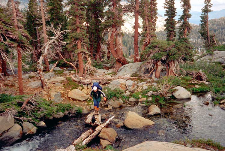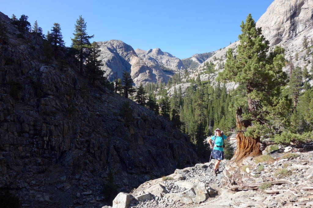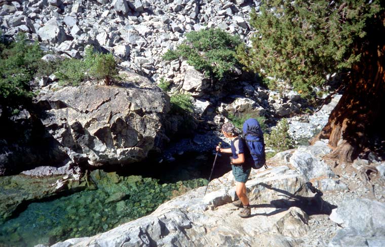 Suitably replenished, we headed on south following the steep sided San Joaquin River on a grand trail camping just below Evolution Meadow after a fine day of JMT trail walking.
