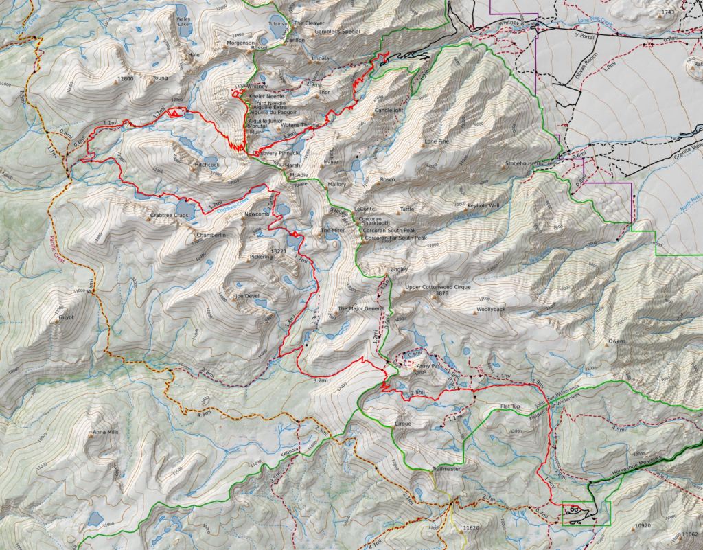 After a beautiful sunrise over the lake with some snow patched mountains behind, we set off uphill on trail on a grand hike past lakes and some frozen snow patches. We had brought mini crampons- ‘micro spikes’ to fit over our trail shoes and these worked perfectly for moving quickly up the snow. The pass was fairly gentle and scree covered but had good views out west to the jagged ridge of the Silver Divide and the green meadows of Tully Hole below- our descent line.