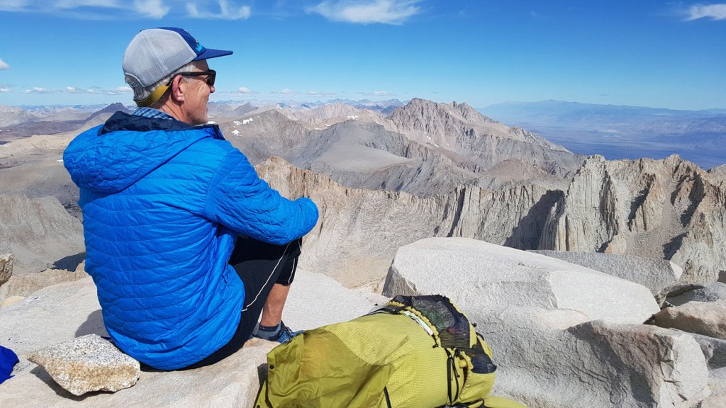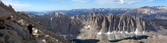We were flying by now, climbing steadily up the trail to Whitney Trail Crest with more than 4 weeks hiking fitness behind us. Some fantastic views higher up across the fluted mountains and lakes and we passed a few hikers coming up from the other side of the mountain. Saw some marmots and pikas on the way. After we had bagged the highest point of Whitney we then started the long, long descent east to the road- 6,500 feet roughly. The top half was particularly grand seeing into Whitney’s rocky east face and dotted lakes below.