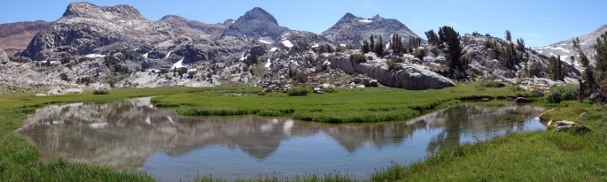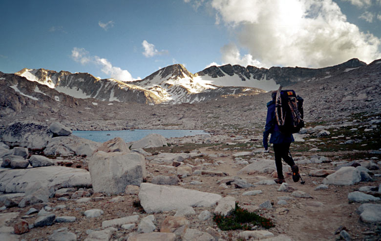 This was an idyllic valley with lush green meadows and wildflowers, marmots, pika, chipmunks. We eventually connected lower down with the John Muir Trail at a river crossing at Tully Hole – mozzy central!- and followed the JMT northward for a wee while. It was obvious this was a heavy used trail, as well as seeing lots of people, the trail was wide and dusty from many foot and hoof marks. Still it was pleasant hiking and soon we reached Lake Virginia where we cut off cross country northwards up a shallow drainage over a small pass to the the Rams Lake area to camp. Man this was nice up here above the treeline, amongst the small lakes and rough hills around!