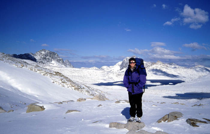 We reluctantly left the restful lodge on the boat the next day, hiking on fresh snow in more lovely country all the way up to pitch the tent with hats and gloves near Seldon Pass. Our tactic in the morning was to get up and hike quickly in the freezing cold until we were hit by the sun, at which point we stopped and had breakfast. Evolution Valley was wonderful with its waterfalls, lakes, mountains and clear, clear autumnal air- the Sierra were well named ‘The Range of Light’ by John Muir the Scottish born naturalist and “Father of the American Natural Parks”.