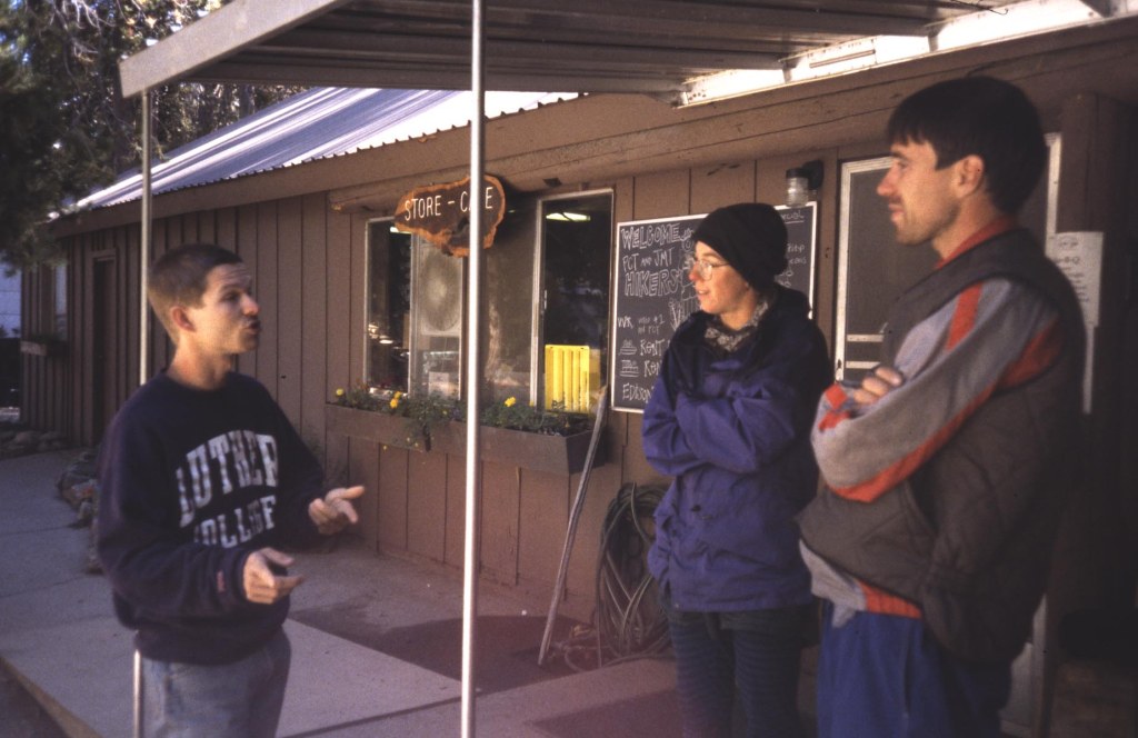 Our aim from there was to hike to Vermillion Lake and take a boat ride to the resort at the far side of the lake. Our only problem being that we didn’t know when the boat ran so we got up at 6am and hiked down to the steaming, frosty lake edge, cooked breakfast with some hot mugs of tea and waited. Luckily, the boat arrived at 9.45am disgorging other PCT hikers El Nino and the Nike Girls along with a lama! After a chat we had a lovely 4 mile trip across the lake to the lodge – only to meet our PCT friend Brian Sweet last seen in Washington state. He had finished the trail ahead of us and had got a job as a waiter at the lodge until the end of the season. It seemed that the other hikers had been told to keep it a surprise for us that he was here!
