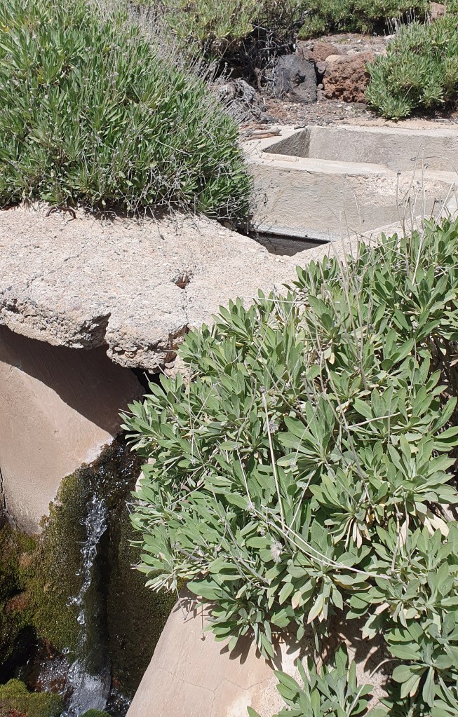 I was now climbing steeply up a valley on open lava slopes with feint trail and cairns. I followed a tiny (now broken) aqueduct line before coming upon a strong water flow emerging from a pipe into a concrete tank. Probably the best water source I saw on either of the islands!