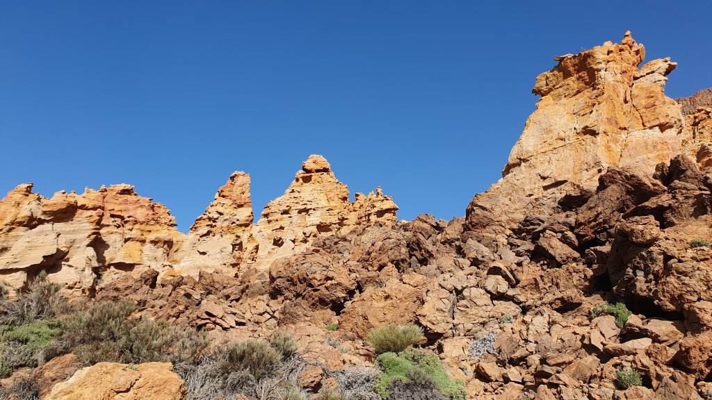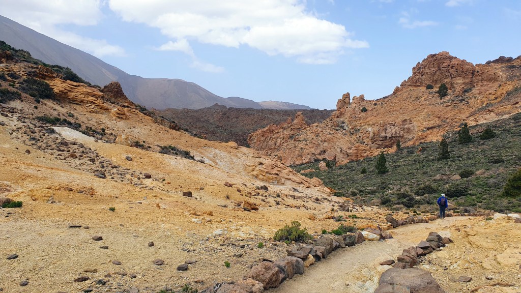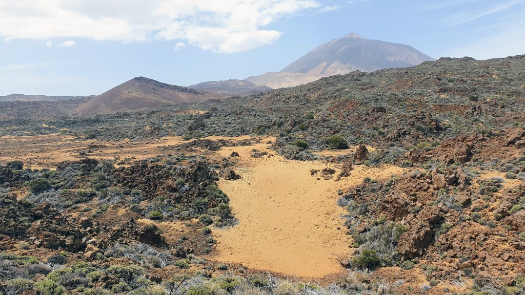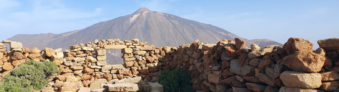First thing in the morning I hiked up Guajara the hill beside camp with views across to El Teide and thankfully a bit less haze than on previous days. The ruins of an old observatory adorn the summit (see banner picture above), seemingly the first high altitude observatory. Returning back to the trail there was a long flat section on jeep track skirting the south of El Teide around the lava fields and I saw a few other hikers and runners here. I headed to the road at El Portillo Alto which had a couple of busy cafes so I hiked on down the road for a mile or so to El Portillo Visitor Centre. I wanted to pick up water but the taps at the toilet had ‘Non Potable’ signs up. Since this was likely my last chance for water before tonight I hiked back to the first café and sat down for a sandwich and chips and filled up on water there. Probably a 5km round trip….but worth it!