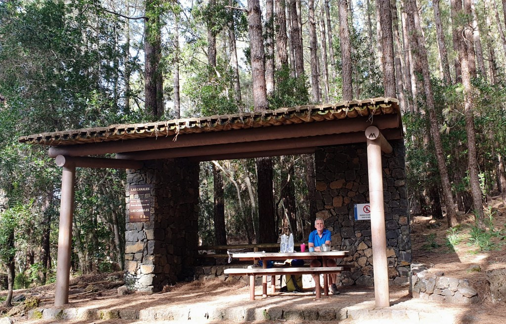 From El Caldera I climbed about 2,000 feet up in pine forest to reach a well crafted trail undulating round very steep sided hills – reminiscent of the Pacific Crest Trail in southern California. It was here that I met Toby coming the other way. He was hiking all the islands on the GR131 and had the tiniest backpack I think I have ever seen, using a poncho to double up as a tent. After an interesting chat about trails covering everything from Arizona to Sweden we departed on our ways with the temperature cooling nicely in the late afternoon. I stopped at the wooden shelter of Las Canales to cook up dinner with the luxury of a table and benches.