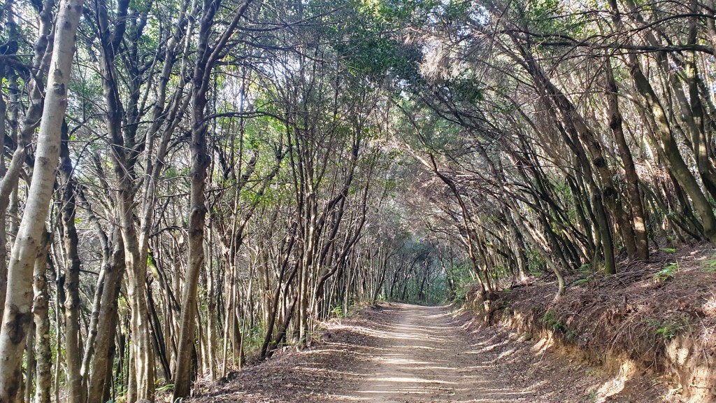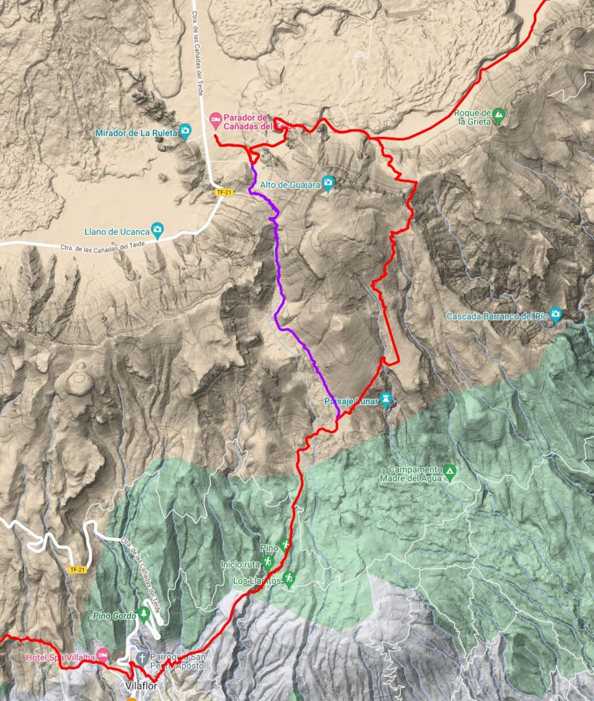 From there, the good trail climbed a bit more steadily to the edge of the treeline with views to raw lava hillsides above. I took a minor trail away from the GR131 rounding the west side of the hill of Guajara to get to the National Park centre at Parador. This looked an interesting route in itself and meant I avoided doing a part of the GR131 twice to get to Parador (purple line on map below).