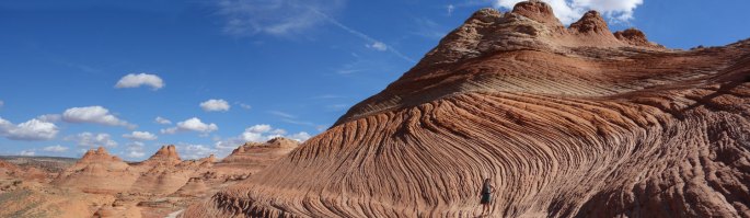 This cairn marks a fun contorted route along the east wall of the canyon scrambling around obstacles before heading more directly up east onto the rim of the ‘waterpocket fold’ itself. We were now on a rocky ridge overlooking Strike Valley to the east with beautiful wavy rock layers and distant views out east to the Henry Mountains and Tarantula Mesa. A series of cairns followed the ridge line southwards with wonderful hiking and views before, too soon, we descended back down into Upper Muley Twist and back down to the car.