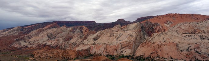Halls Creek Overlook Trail was taken east out of the main creek and it climbed quickly amidst varied colourful rock and boulders. Great views back to the rippled folding rock layers. Rain crept in from the south and we were soon getting wet hiking north now on vehicle tracks. With a long wet dirt road hike ahead of us, we caved in when a SUV passed by and we hitched a lift (thank you!) for about 5 miles to another hiking trailhead called ‘The Post’.