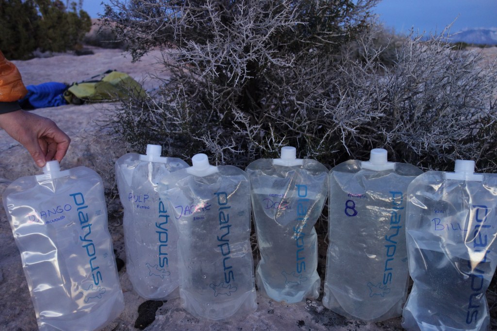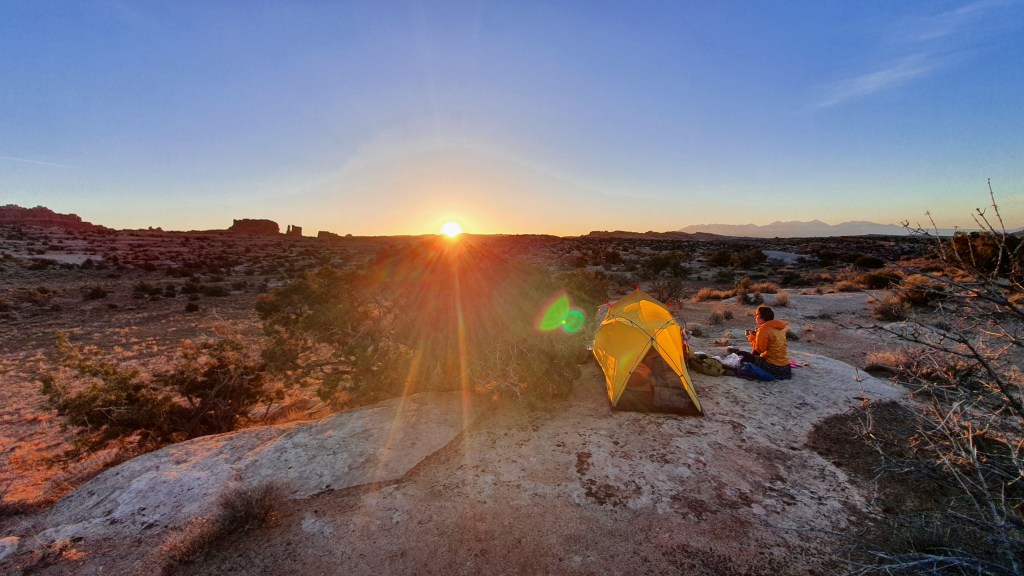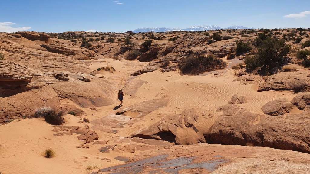 We walked from the desert airport across Highway 191 and towards the Klondike bluffs, a wall of red rock formations at the edge of Arches National Park. A couple of hours on but still outside the park, we made our first camp, snowy hills to the East in the glow of the setting sun, the warm air juniper scented and the distant hum of unfeasibly large American trucks..we were back!!!