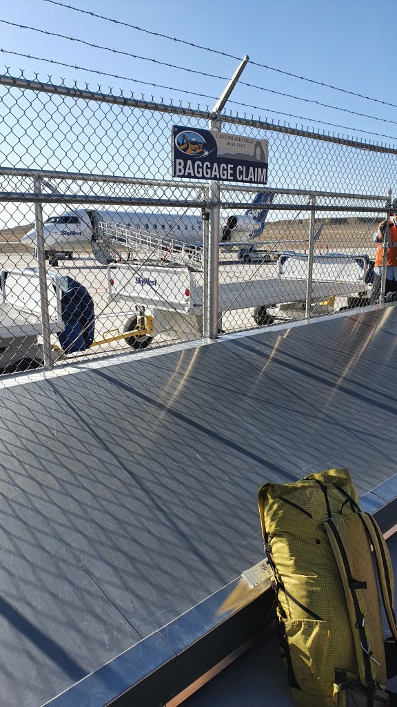 In the afternoon of the second day we returned the hire car at Denver airport: feet only from now on! A 45 minute flight in a bus size plane took us over the Rockies to Moab airport with one rucksack each, all our belongings within and 3 days food.